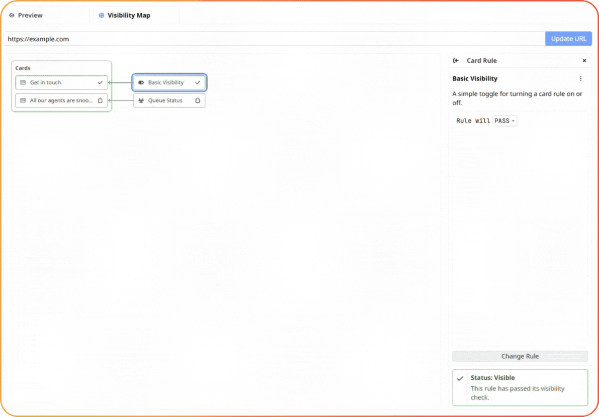 - Visibility rules: Decide exactly when each card, form, or nudge appears based on queue status, URL, or other contextual triggers.